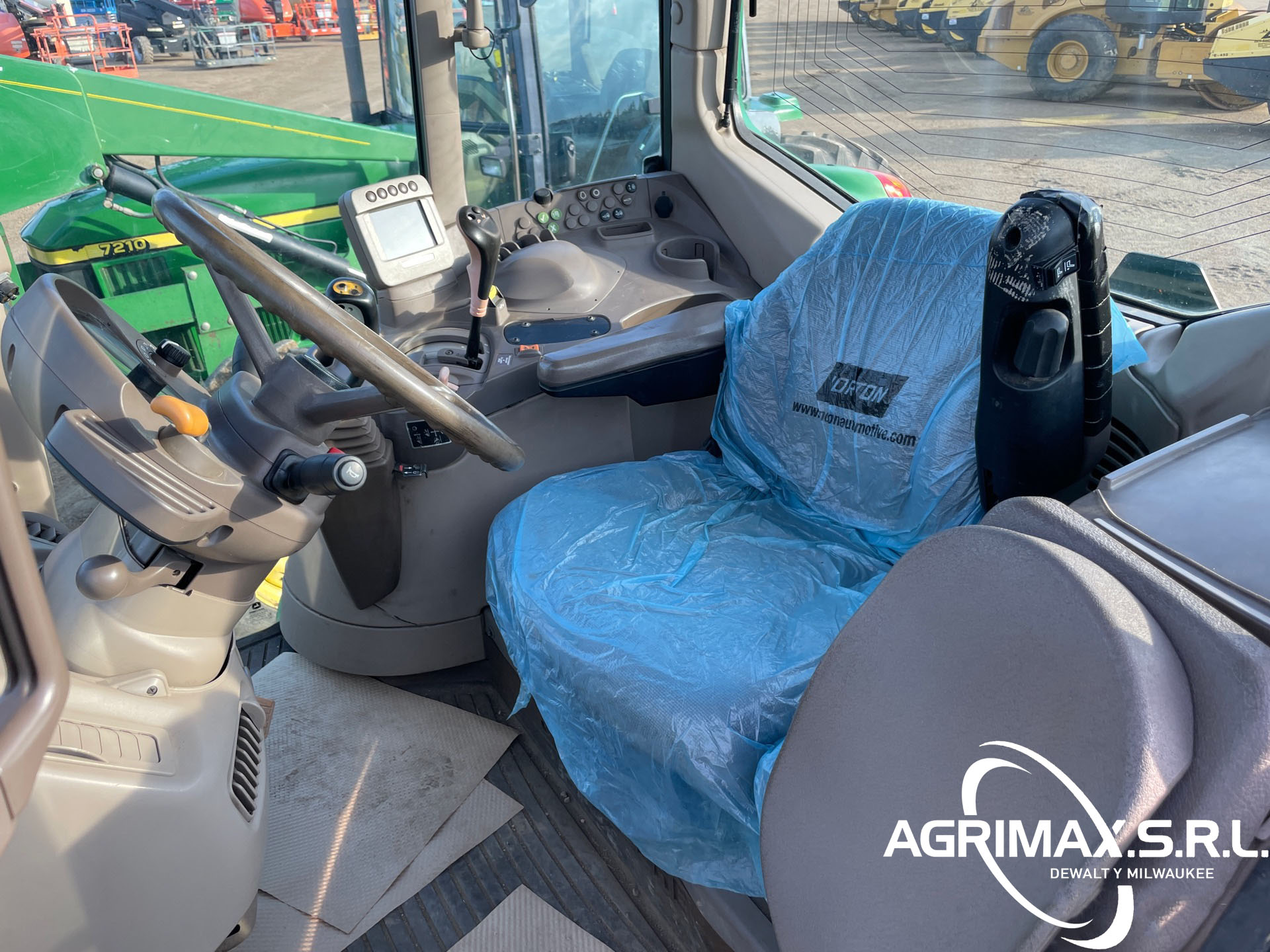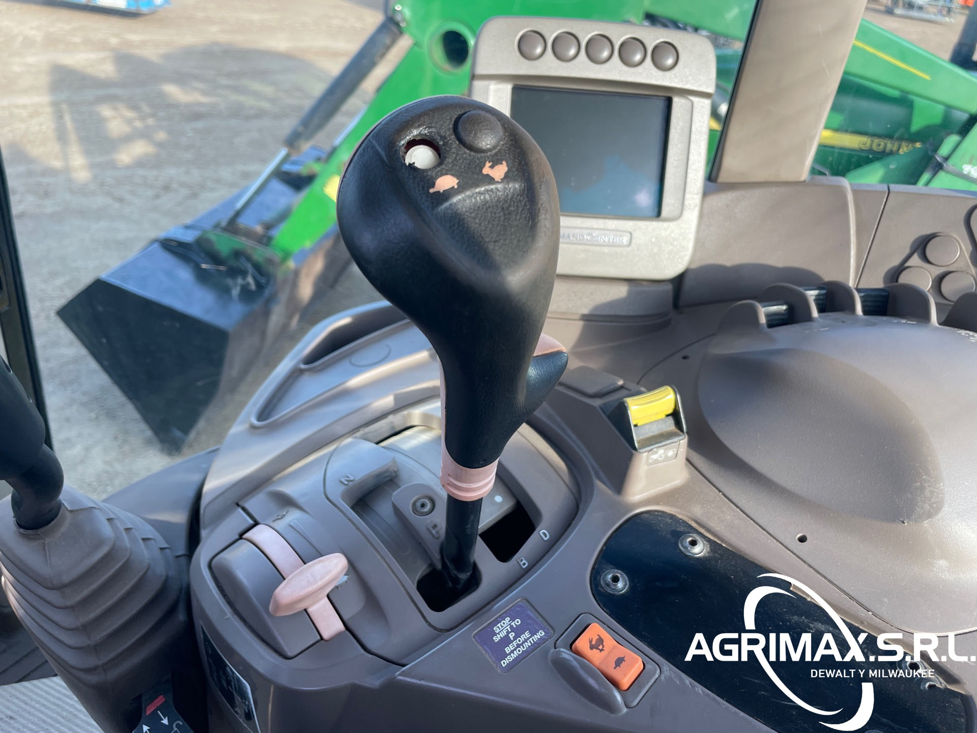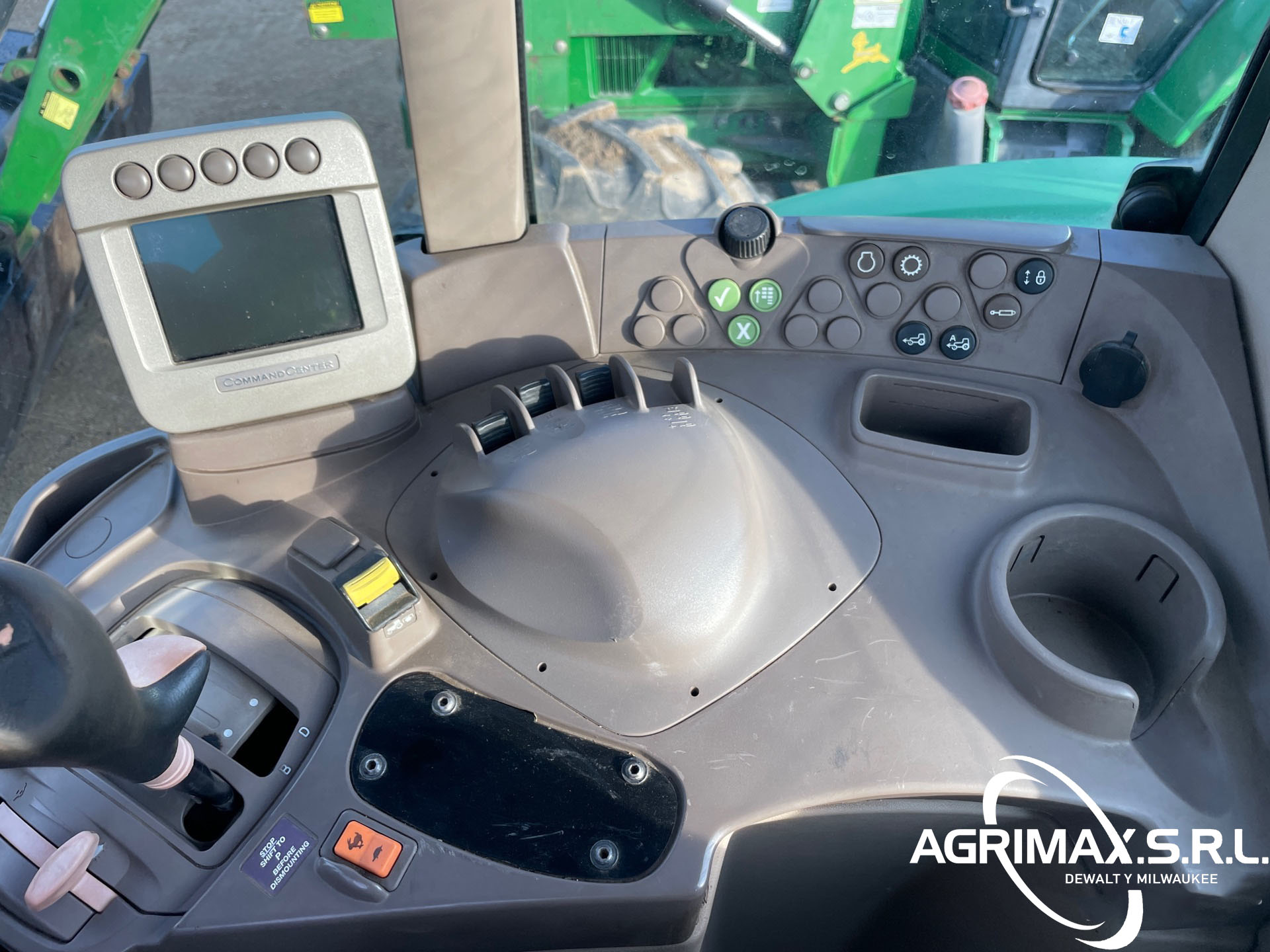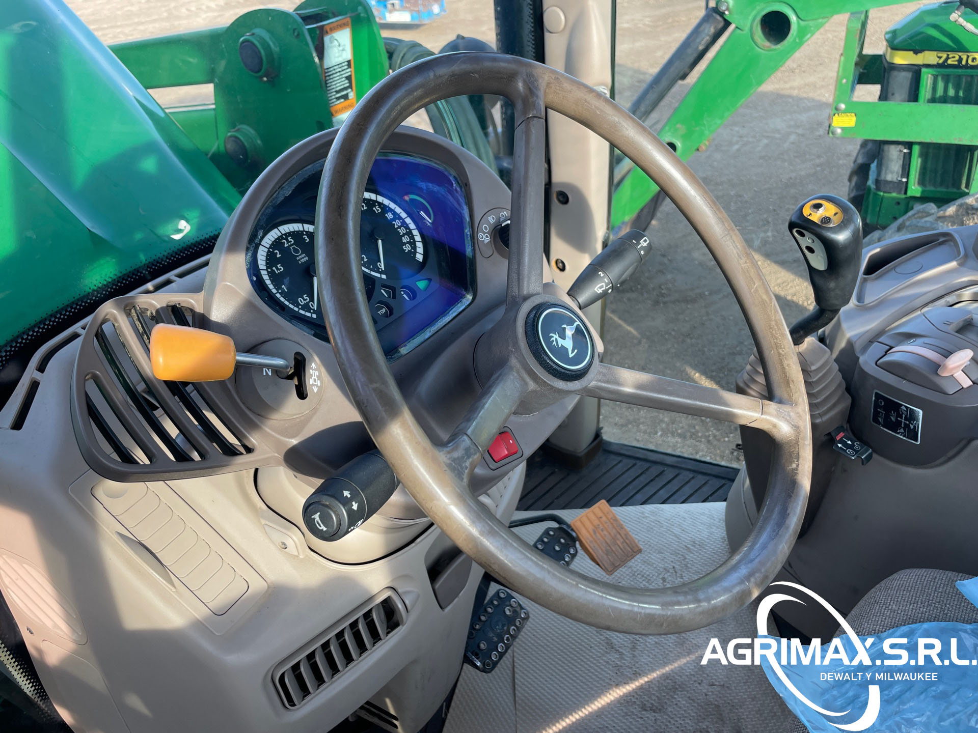 Cabina cerrada, aire acondicionado, asiento con suspensión neumática, bloqueo del diferencial, 16 marchas adelante y 16 marchas atrás, PowrQuad Plus, pantalla CommandCenter, cargador John Deere 741 con palanca de mando, enganche rápido, cucharón con pinza John Deere , 3 controles remotos traseros, toma de fuerza de 540, neumáticos delanteros 420/85R28, neumáticos traseros 520/85R38, contrapesos en las ruedas traseras