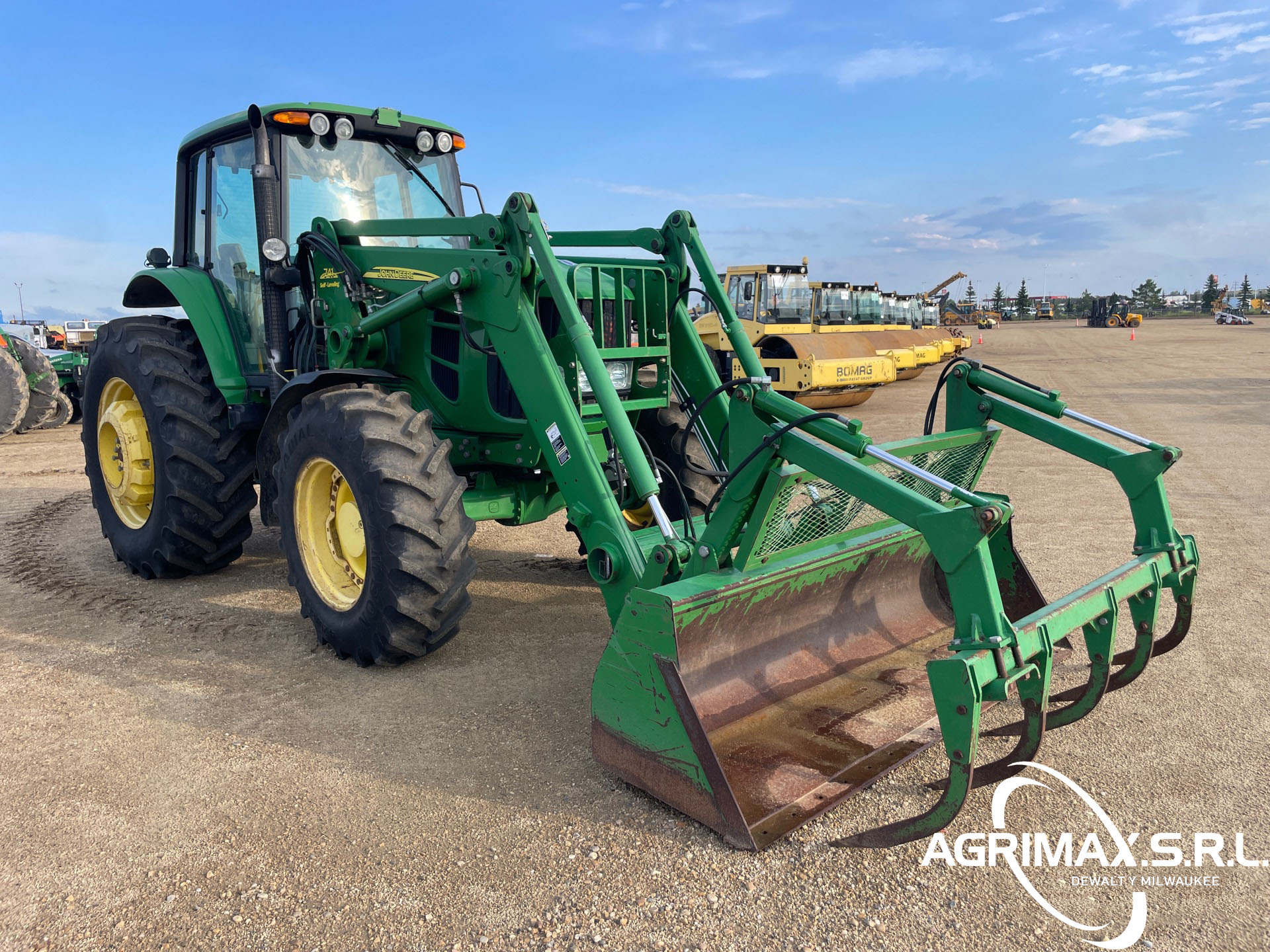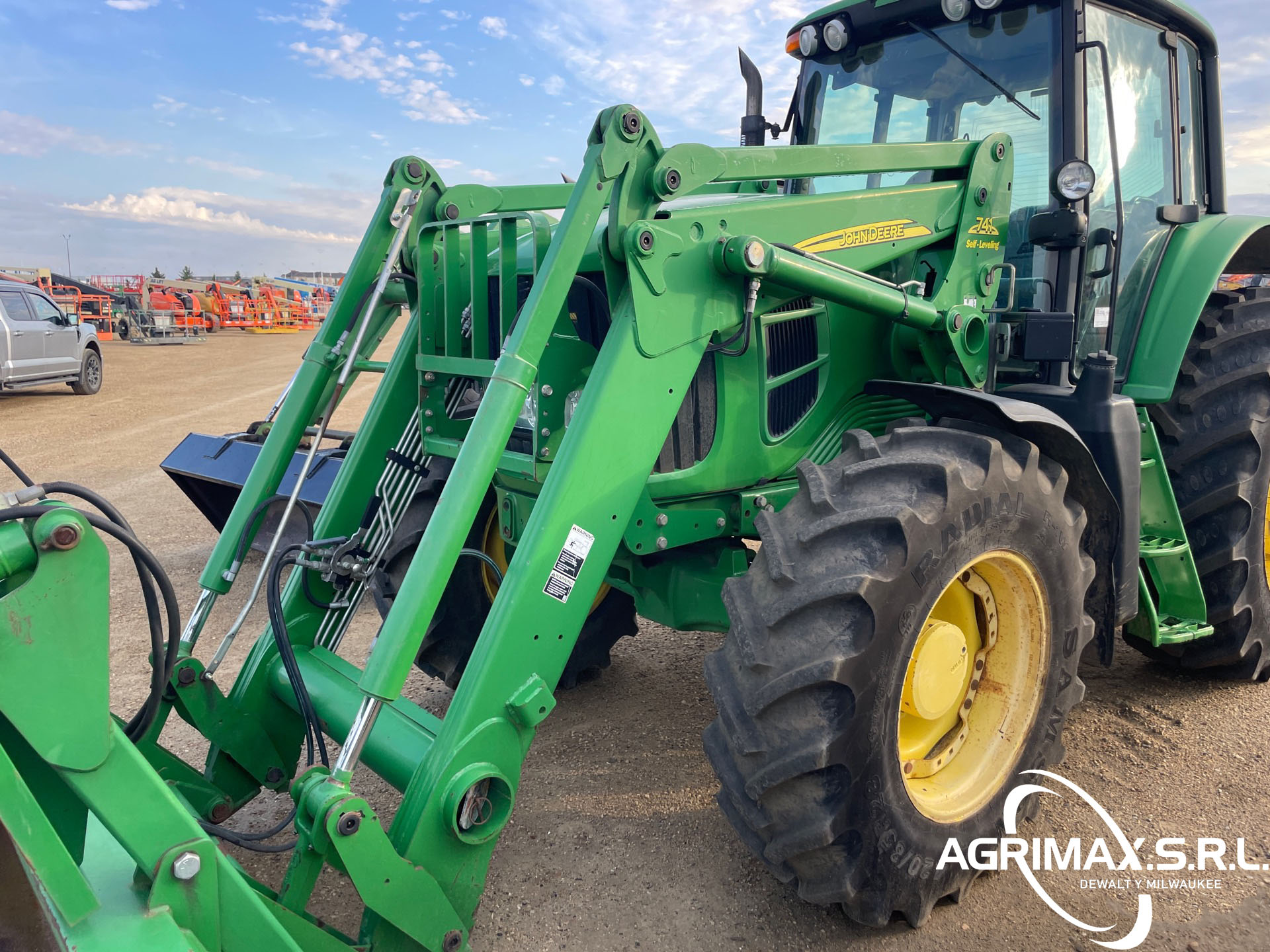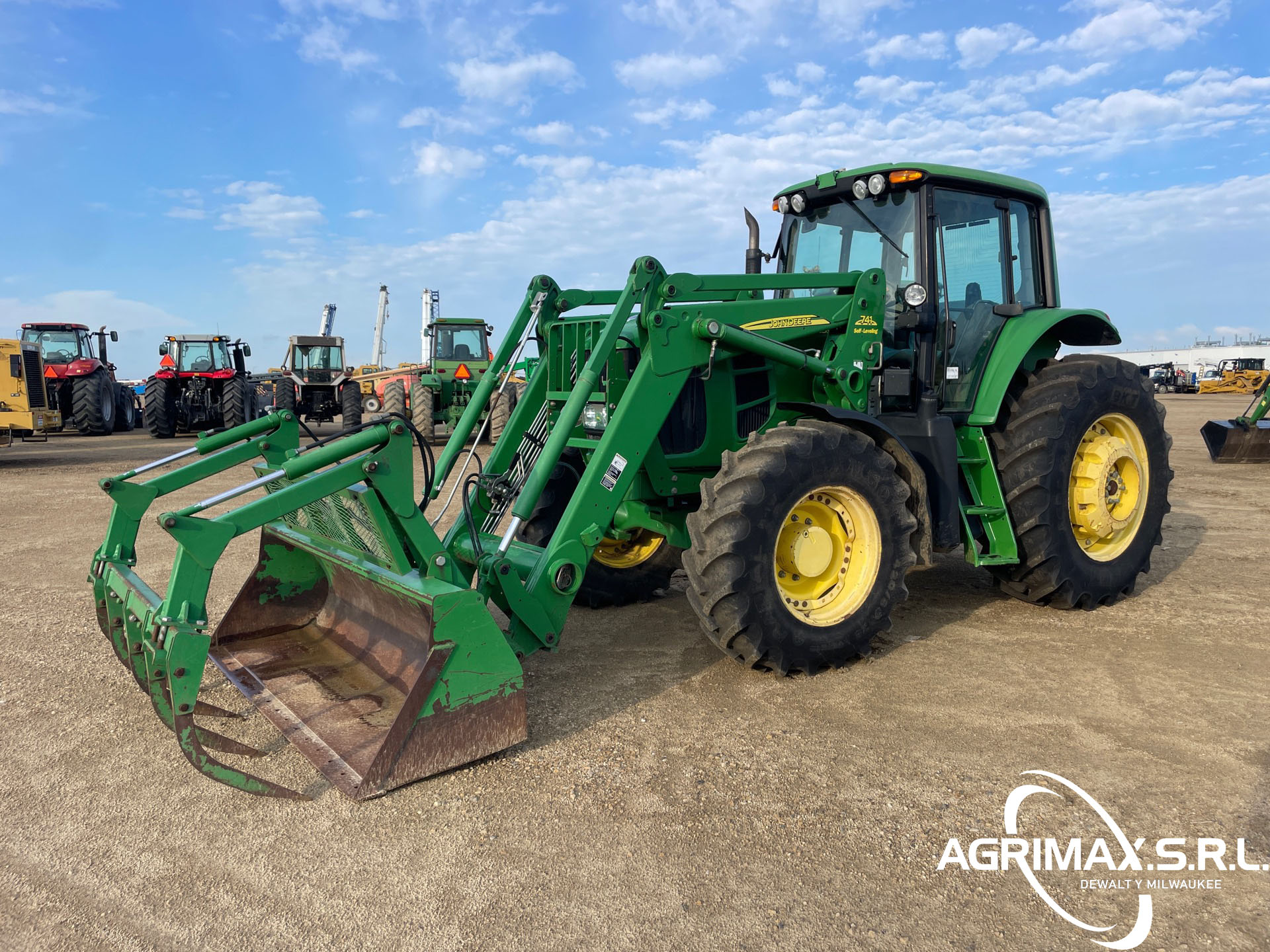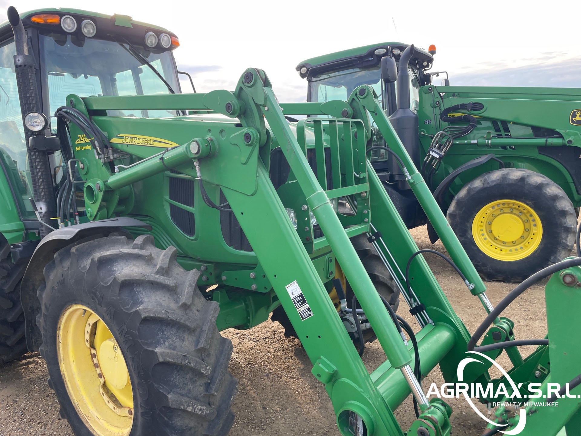Cabina cerrada, aire acondicionado, asiento con suspensión neumática, bloqueo del diferencial, 16 marchas adelante y 16 marchas atrás, PowrQuad Plus, pantalla CommandCenter, cargador John Deere 741 con palanca de mando, enganche rápido, cucharón con pinza John Deere , 3 controles remotos traseros, toma de fuerza de 540, neumáticos delanteros 420/85R28, neumáticos traseros 520/85R38, contrapesos en las ruedas traseras