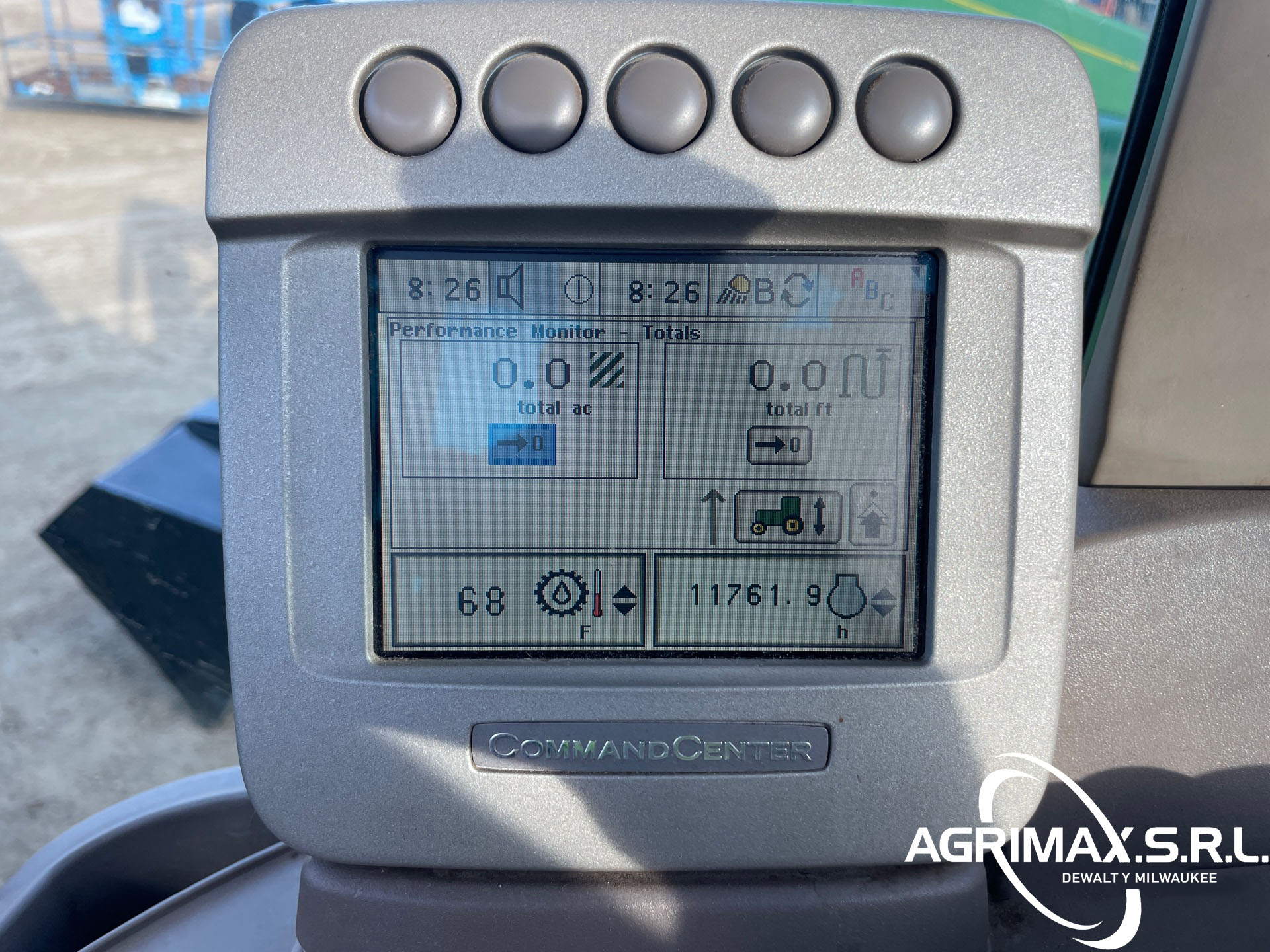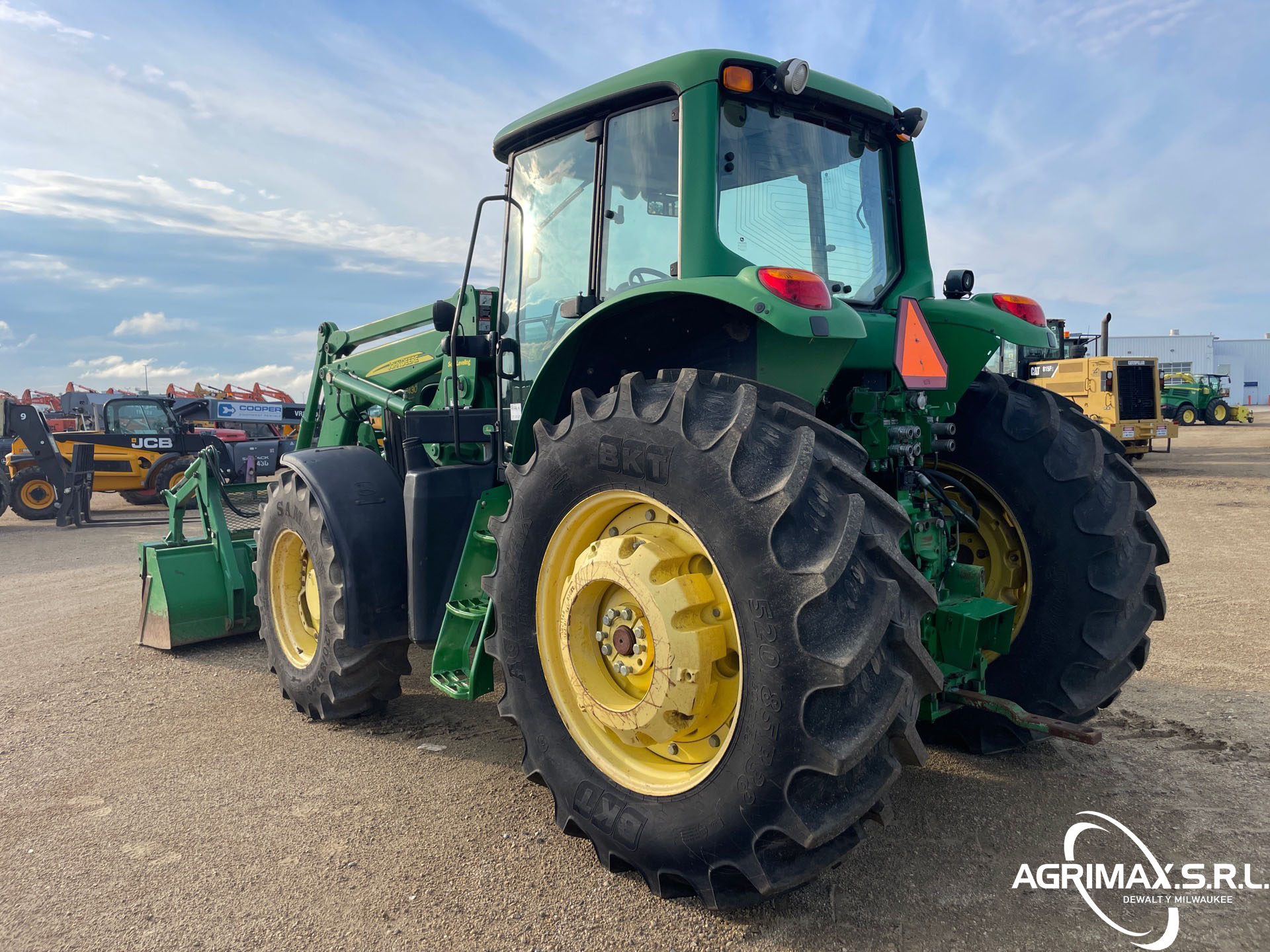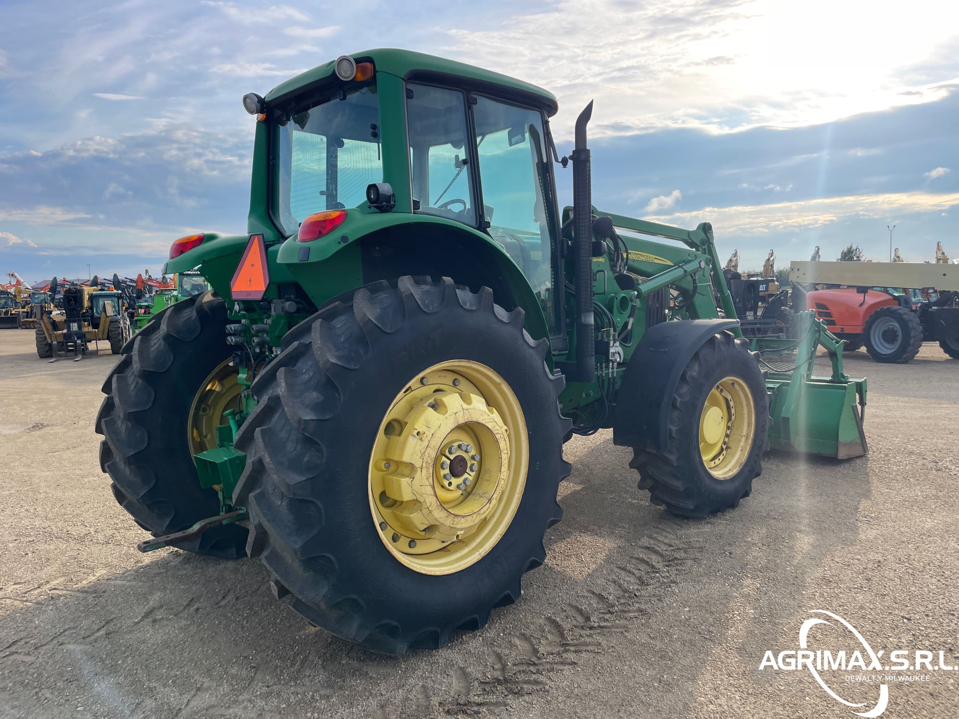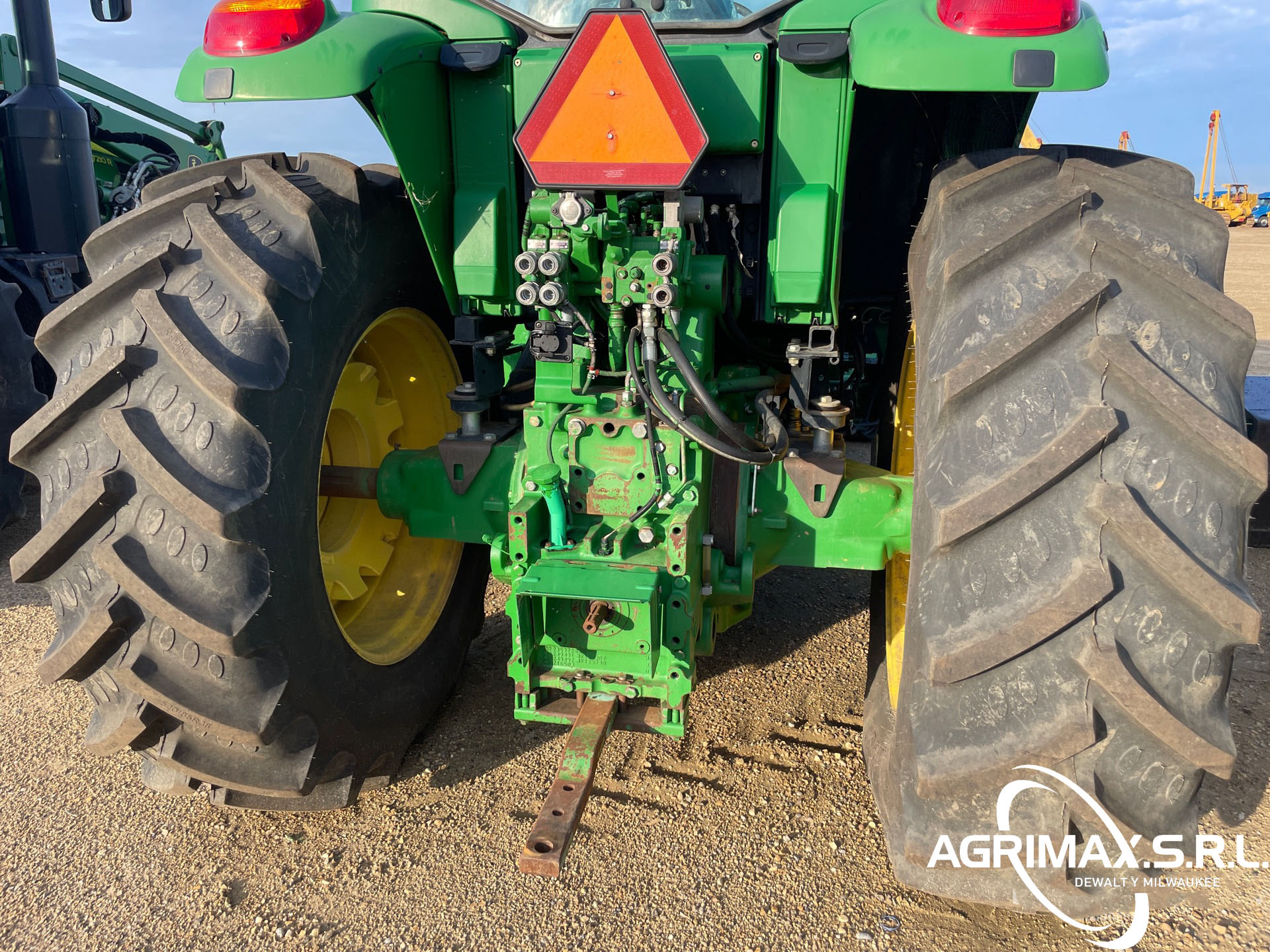 Cabina cerrada, aire acondicionado, asiento con suspensión neumática, bloqueo del diferencial, 16 marchas adelante y 16 marchas atrás, PowrQuad Plus, pantalla CommandCenter, cargador John Deere 741 con palanca de mando, enganche rápido, cucharón con pinza John Deere , 3 controles remotos traseros, toma de fuerza de 540, neumáticos delanteros 420/85R28, neumáticos traseros 520/85R38, contrapesos en las ruedas traseras