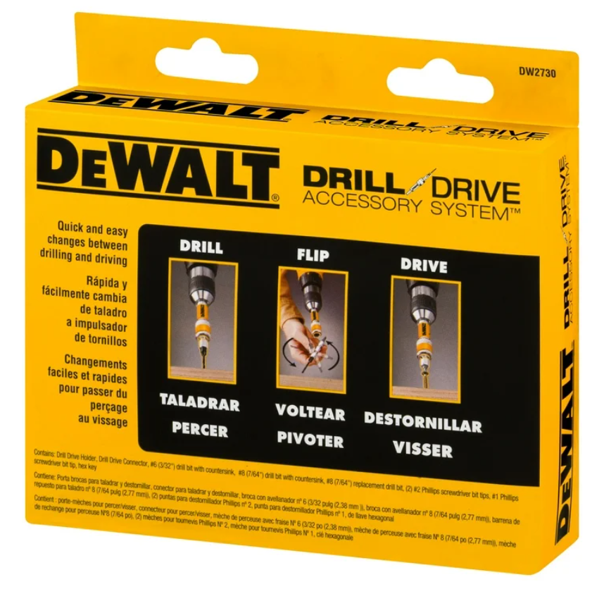 Equipado con un sistema de cambio rápido, el JUEGO DE TALADRO Y ATORNILLADOR DEWALT hace que la transición de taladrar a atornillar sea muy sencilla: simplemente taladre el material, gire la punta e introduzca el sujetador.